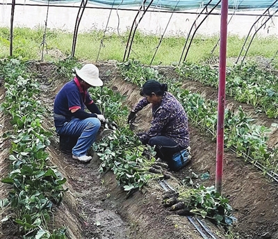 在天民田园农业科技示范园里,工作人员正在栽植红颜草莓。