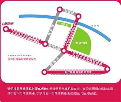 自驾 活动期间,选择驾车前往桃花堤的游客,可将车辆单排顺行停放在距离较近的丁字沽北大街两侧辅路;驾车前往西沽公园的游客可将车辆单排顺行停放在新红路(光荣道至红桥北大街)、红桥北大街(光荣道至新红路)、光荣道(丁字沽一号路至北洋桥)两侧。活动期间,上述道路共新增临时停车泊位1000余个,请游客朋友按照指示牌及交警指挥规范停车。