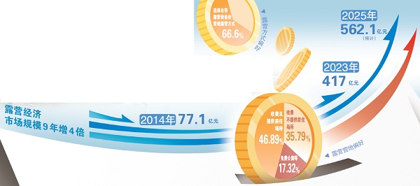 《报告》显示:近年来,我国露营经济市场规模整体呈现出增长趋势。从2014年的77.1亿元逐步增长至2023年的417亿元。由此可见,过去9年间,露营经济市场规模增长4倍多。《报告》预计,2025年,我国露营经济市场规模将达到562.1亿元。