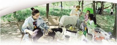 国庆假期,刘艺带着家人到西青郊野公园露营。支起帐篷后,她将露营车中的东西拿出来。只见除了折叠桌椅、防潮垫、卡式炉之外,大部分都是食物。