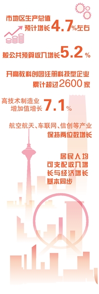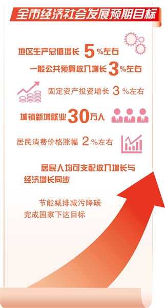 全市经济社会发展的预期目标是:地区生产总值增长5%左右,一般公共预算收入增长3%左右,固定资产投资增长3%左右,城镇调查失业率5.5%左右,城镇新增就业30万人,居民消费价格涨幅2%左右,居民人均可支配收入增长与经济增长同步,节能减排减污降碳完成国家下达目标。