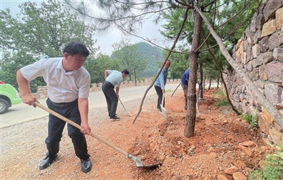 早晨一上班,景区董事长王凤安就带领20多名工作人员上山护绿。他们在第二停车场南部的一处山坡停下来,只见一排排油松正绽放着新绿,王凤安和工作人员挥锨铲土,给每一棵松树培土、浇灌、加固护桩,常州村党支部书记、村委会主任董云鹏也赶来一起参加植树造林,大伙干得热火朝天。
