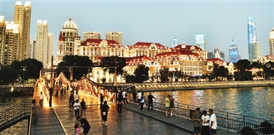 沈丹彤来天津生活已经三年多,她是一位自媒体博主,在积极探索城市的过程中积累了一定经验。她多次从天津之眼沿河步行至津湾广场,“边走边看,边看边拍,特别顺畅,一点不觉得累。”她对解放桥段的夜景情有独钟,“人站在桥上,楼体上的灯光秀打出《千里江山图》时,海河里又有游船经过,眼前的一切就像是画中画、景中景,美不胜收。如果想要留住这个美好时刻,我建议抓拍Live图(实况动态照片),效果非常震撼。”