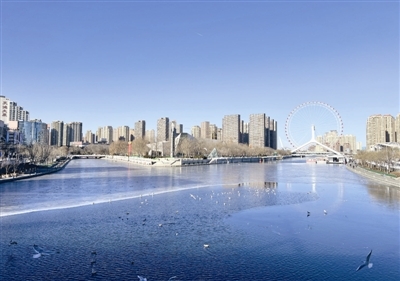 昨日,本市天气晴好,海河三岔河口呈现“半河碧水半河冰”的景致。水面薄冰晶莹,与粼粼波光相映成趣。