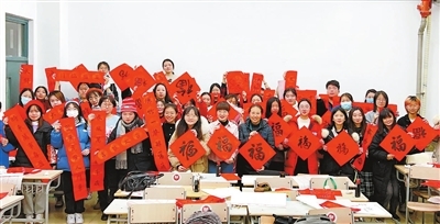 大学生在书法活动上写“福”字、春联。 受访者供图