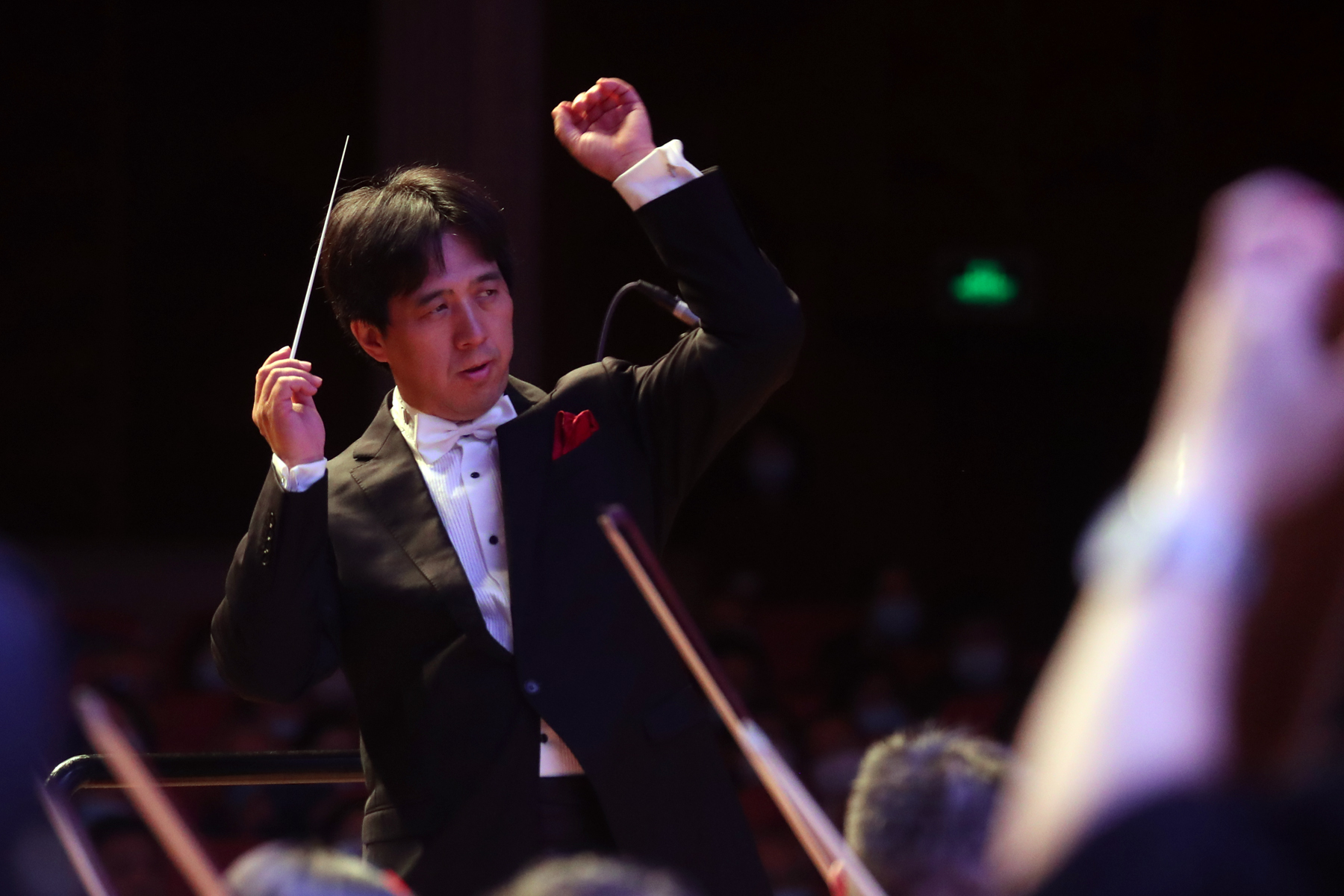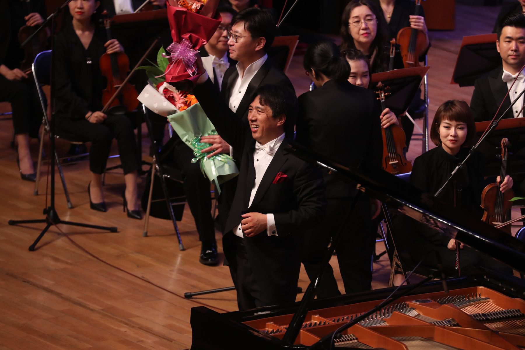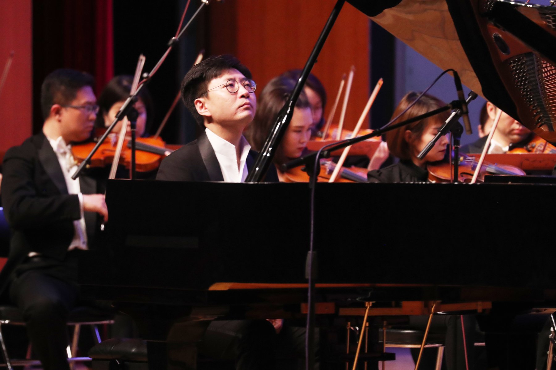 下半场,一曲《我的中国心》令在场观众心潮澎湃。接下来,著名钢琴演奏家谭小棠与天交合作演出了音乐会的另一部重头戏钢琴协奏曲《黄河》。这部作品改编自冼星海的作品《黄河大合唱》,是中国钢琴协奏曲中最负盛名的作品,家喻户晓。谭小棠展现出对作品深刻的理解和炽烈的感情,他的击键精准迅捷而又富于节奏感,特别是在经典的第四乐章《保卫黄河》中,作品宏大的旋律在他的指尖达到最高潮,令全场观众感受到如奔流不息的黄河般的中华民族伟大精神。