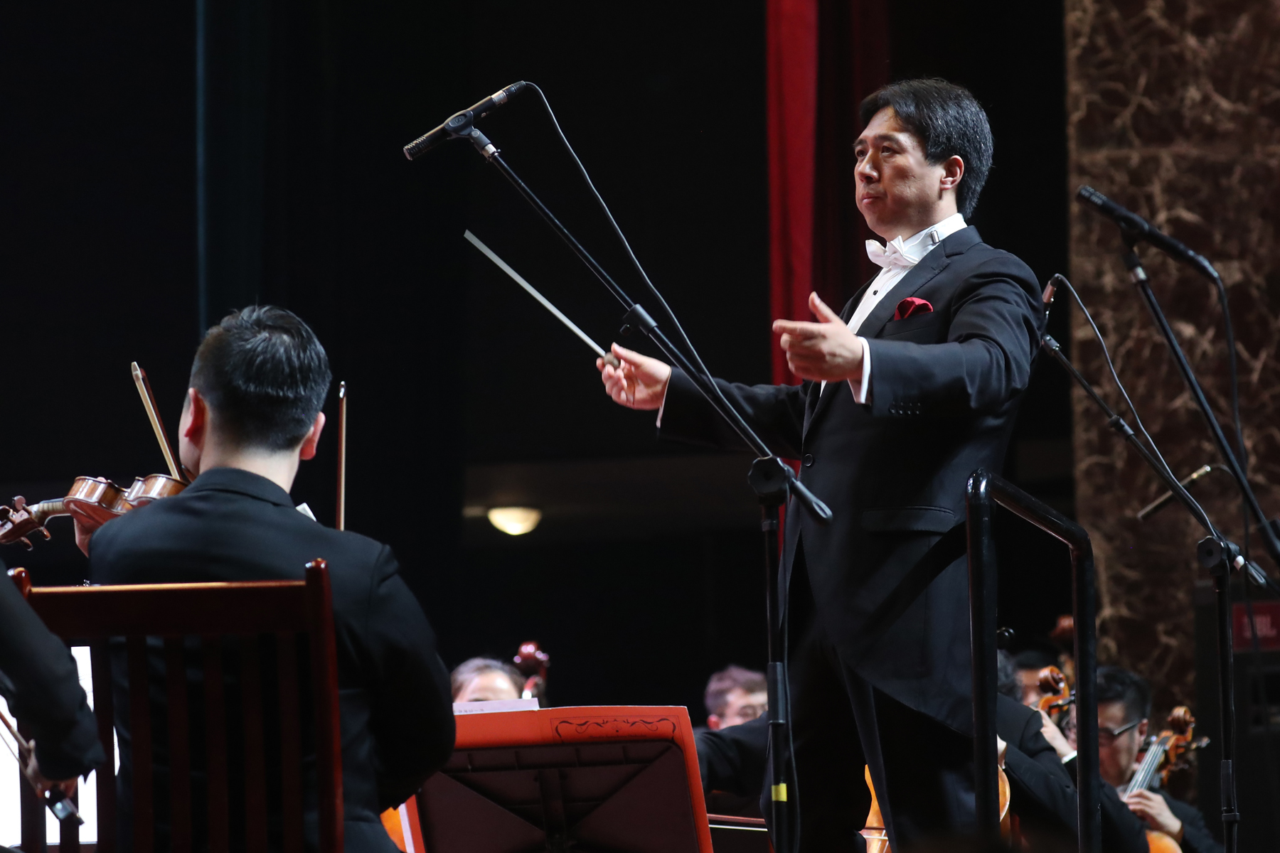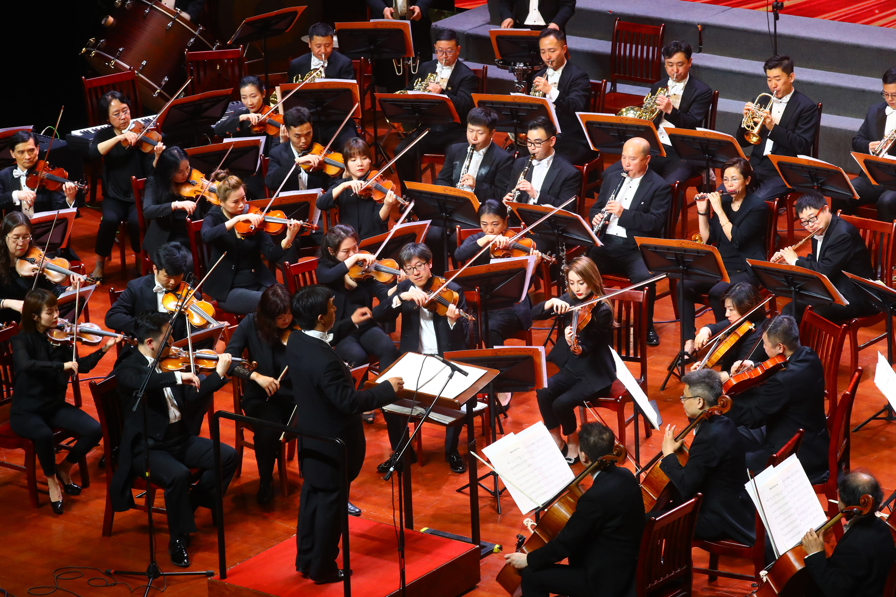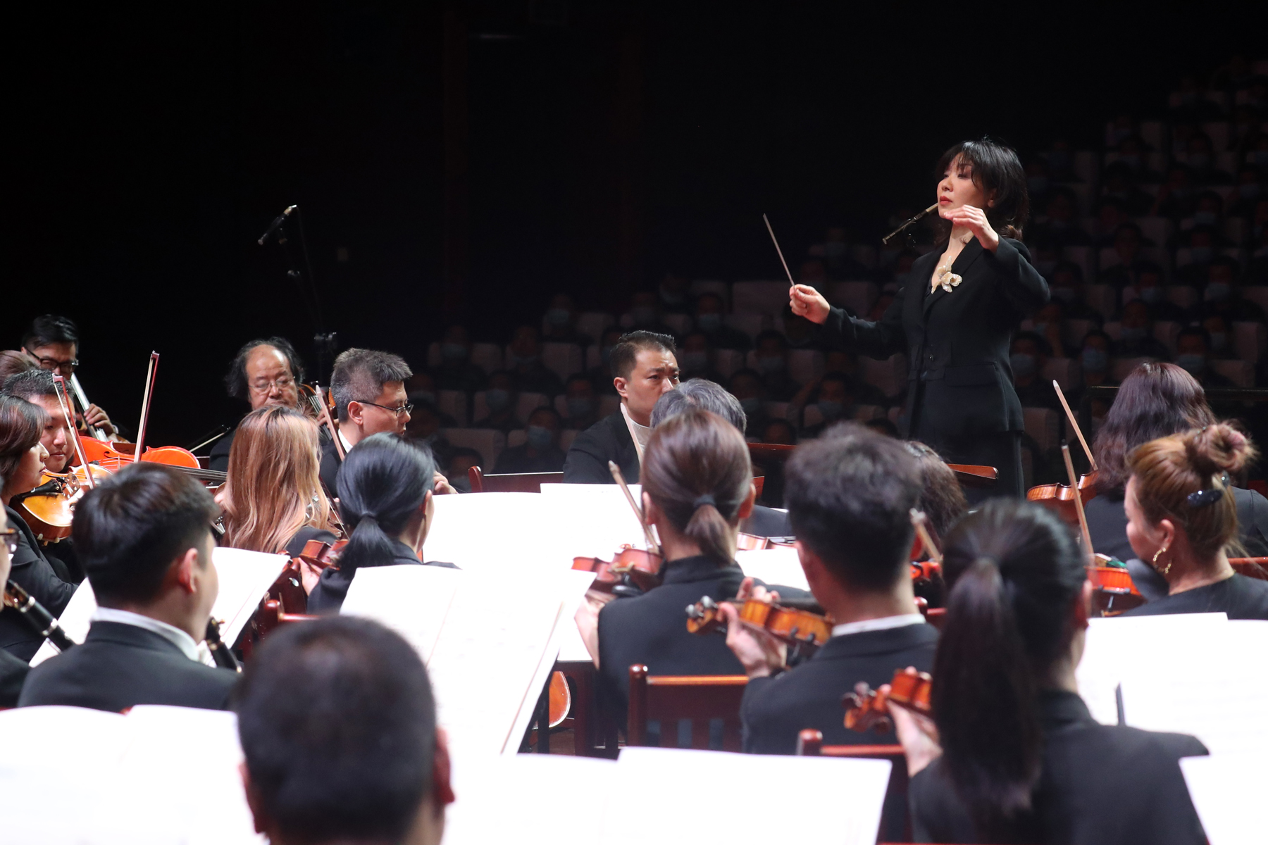 在激情澎湃的《红旗颂》旋律中,易娟子率先执棒拉开了音乐会上半场的序幕。她坚定自然、优雅大气、刚柔并济的指挥气质和风格深受大家的喜爱与赞赏。随后的芭蕾舞剧《红色娘子军》组曲选曲、电影《开国大典》插曲《人民万岁》、《我的祖国》等乐曲深切地表达了爱祖国、爱人民的浓烈情怀。女高音歌唱家黄显淳深情献唱了《我爱你,中国》和《英雄赞歌》,她动人的歌声将对祖国的无限深情抒发得淋漓尽致,同时也歌颂了保家卫国的英雄形象。