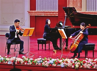 天津交响乐团小提琴演奏家张帆、大提琴演奏家石佳琦,与天津音乐学院合作钢琴家任春颖组成的“微云钢琴三重奏”,携手中提琴演奏家张浩然,上演多部跨越古典与当代的钢琴三重奏作品,导赏嘉宾贾彬深入浅出地带观众领略了室内乐魅力。