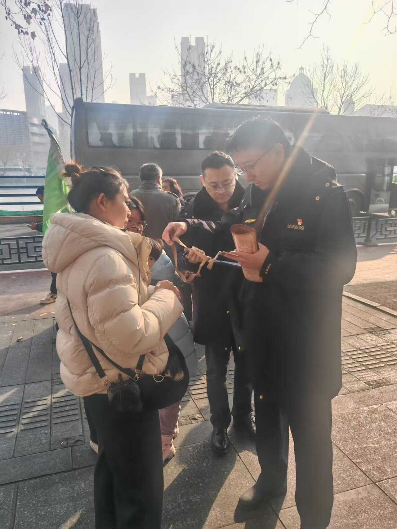 为让执法精准高效,两部门提前做好周密筹备,明确目标与分工,为行动规划清晰“路线图”;还结合我市往年旅游市场特点与游客出行规律,锁定执法重点区域,将古文化街这一热门景区,特别是其大巴车停车场及区域内麻花购物店纳入核心检查区域,确保执法力量向游客集中区域倾斜,避免“撒网式”低效执法。检查过程中,一方面由文化旅游部门执法人员对旅行社、导游的相关资质材料和旅游合同、旅行团人员名单、保险单、旅游行程单及旅游费用等进行详细检查。一方面由交通运输部门执法人员对旅游车辆包车合同、客运经营许可证、道路运输证、线路牌及驾驶员资质进行执法检查,告知旅游经营者必须承租合法合规营运车辆,确保旅客和车辆安全出行。