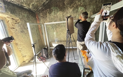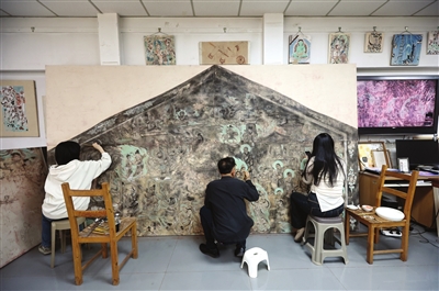 在展示现场,“移动敦煌”采用管架和模块搭建,既可以拆卸转运,又可以进行动态绘画展示。