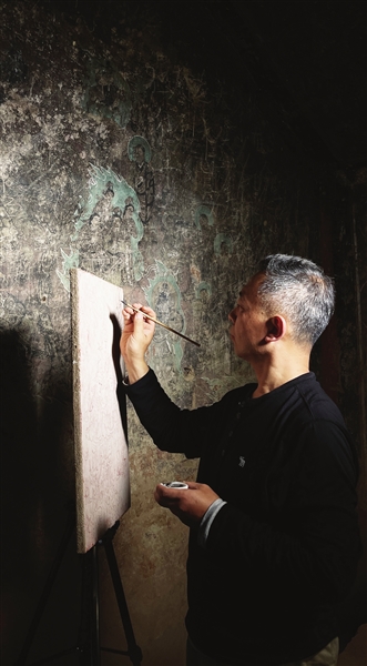 这场复刻更是一次文明接力。在国家艺术基金支持下,赵栗晖主持完成了“肃北‘五个庙石窟’整窟复制及壁画复制人才培训项目”,15名来自全国以高校教师为主的学员和天津美术学院重彩方向研究生组成“壁画翻译团”,在赵栗晖和敦煌研究院壁画专家邵宏江、肃北博物馆馆长赛依吉尔格力等指导下,使用了最贴近古代壁画的材料、结构及绘制方式,从精准拷贝过稿到“一笔三描”,在保留传承中国古代壁画绘制技艺基础上,完整还原了石窟历史风貌与艺术精髓,同时培养了一批专业的壁画复制教育人才。赵栗晖说:“培养人才、挖掘价值、有效利用、让文物活起来,是这个项目的初衷和目的。”