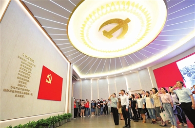 党员在上海中共一大纪念馆里重温入党誓词(2021年6月3日摄)。