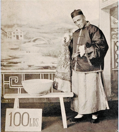 在一张老照片上,朱连魁身旁有一个大碗,标注着100磅,这是当年“大碗飞水”表演的场景。