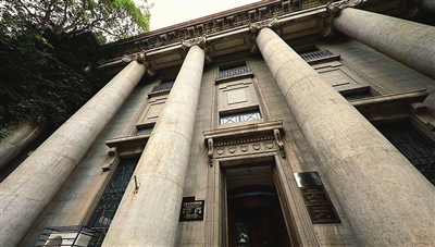 该建筑主立面朝西,面向解放北路。中部墙体向内凹入,由六根通高的爱奥尼克柱式巨柱营造深邃而极富光影效果的柱廊空间,气势恢宏。柱廊内,首层外门窗均被挑檐分为上下两部分,上部是小扁窗,下部为矩形大窗或大门。这种设计将层高巨大的首层立面修饰成两层的感觉,通过拆解的手法弱化了过于巨大的体量感,在满足采光的同时亦避免了外门窗过长造成的比例失调。窗槛墙采用比较简约抽象的凹凸方块装饰,窗两侧为带凹槽的方形窗套。大门上方的挑檐略低于两侧外窗的挑檐,形成韵律变化,同时加强了主入口的引导性。主入口前设十三级大台阶,踱步走上台阶,立于宏伟的柱廊下,一股庄严肃穆的气氛迎面而来。大门有两层,外层是一对雕花大铜门,门内是一组沉淀了岁月痕迹的木质旋转门。
