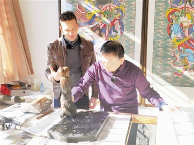 外国友人参观霍庆顺(右)印制年画。