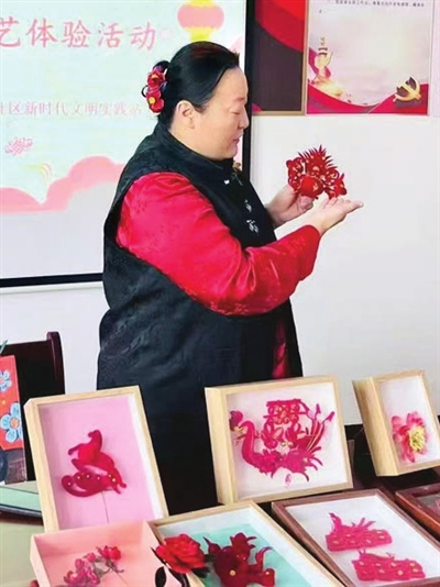 近几年来,为了传承非遗,苏秀兰也是下足了功夫。她在努力带徒弟的同时,还积极宣传非遗,扩大尚氏绒喜花制作技艺的知名度,让大家都了解非遗。苏秀兰坚持走进社区、学校,积极参加区里、镇里各项活动,在不同人群中宣传非遗,手把手地教大伙如何制作绒花。她几乎每周都要到各个社区开展非遗讲座,不仅将技艺免费教授给居民,而且还免费给居民发放制作绒花所需的原材料,让居民们制作非遗绒花。