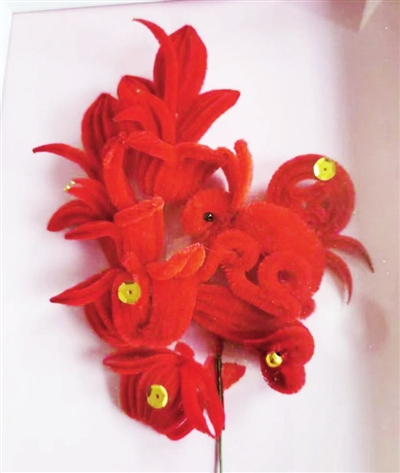尚家祖辈一直从事绒花的原材料蚕丝的染制及成品的制造,当年,尚鸿江的父亲还在红桥区三条石一带开了一家很大的绒线庄,以染绒为主营业务。苏秀兰介绍,绒花制作工序非常繁杂,需要用蚕丝为“肉”,用铜丝为“骨”。目前,尚氏绒喜花大约有100多个品种,而不同的绒花,也有着不同的寓意。苏秀兰拿着一个做好的红色聚宝盆说,别看聚宝盆不大,但是制作起来却并不轻松,每一个细节都要处理到位,才能以最好的姿态呈现在顾客面前。