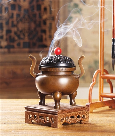 说到这里,王斌馆长在现场又展示了一件朝冠耳竹节熏炉,此炉两个朝冠耳(官帽耳)为竹节状,炉身錾刻片片竹叶。“一位天津收藏家李先生慕名到‘炉天下’博物馆参观,看到博物馆一心传承宣德炉文化,而且又非常专业,让他颇为感动,于是就把他自己多年前在欧洲拍得的一件清代早期竹节熏炉带到博物馆来,无偿提供给‘炉天下’博物馆进行研究和复制。复制品和原型神韵完全一致。此后,我与李先生也成为了好友。”王斌说。