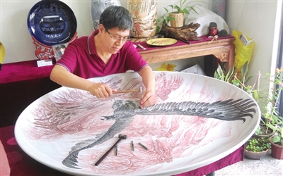 陈起平最初只是刻盘子,后来逐渐开始尝试在各种瓷器上雕刻,从碟子到瓷板,从小茶杯到大瓷瓶,每一种形态都带来了不同的挑战。