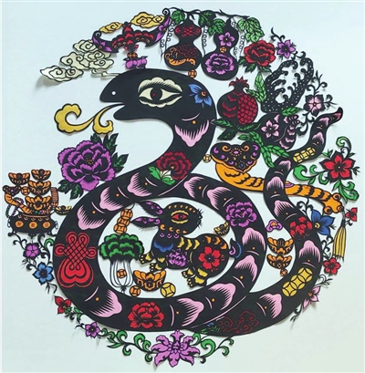 今年是蛇年,大家会看到剪纸作品中经常出现“蛇盘兔”这么一个题材,蛇盘兔是传统民俗中的一个说法,称为“蛇盘兔必定富”或者“蛇盘兔辈辈富”。北方地区,例如山西、陕西、河南、河北、山东等地都有这个说法。按说蛇把兔子圈住,兔子不就被吃了吗?怎么和吉祥相关呢?我最开始问了很多老剪纸手艺人,没得到答案。后来查资料,才发现“蛇盘兔”最开始是风水学中一种地貌的名称。古人认为将先人埋在这样的地形中,将来对后辈有利。蛇盘兔辈辈富,之后逐渐演变成代代相传的俗语,并在很多传统文化形式中有所体现。