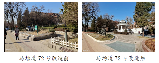 马场道72号时光花园占地面积975平方米。2021年,和平区将这里列为“口袋公园”建设提升改造项目。改造中,增加了标志性景观的亭子,兼顾美观和实用。现在这里,在传承了马场道百年历史文化的同时,也成为了百姓日常休闲的好去处。