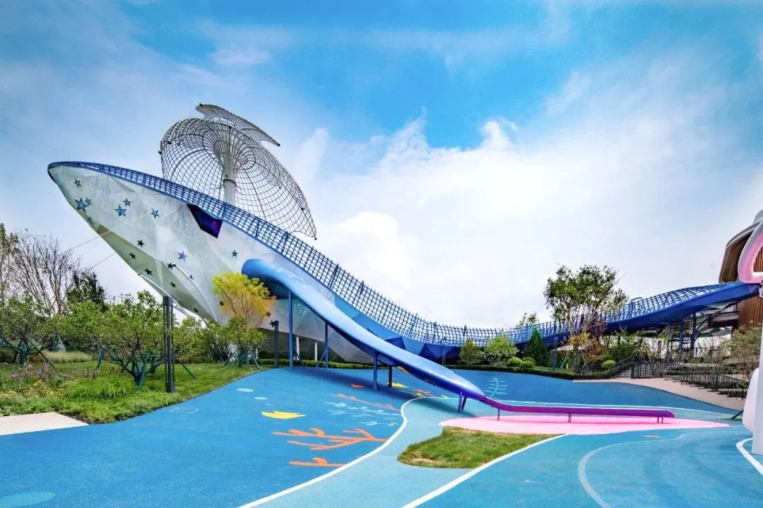森海乐园里最醒目的蓝色巨型“鲸⻥”是一个儿童游乐园,高低起伏的内部空间和巨大的滑梯,将冒险体验拉满。晚上,高耸的“智慧树”还会发光,照在以粉、蓝为主色调的乐园里,给孩子们带来一场梦幻之旅。温馨提示:近期“鲸⻥”外部正在进行养护,现场游玩请听从工作人员引导。