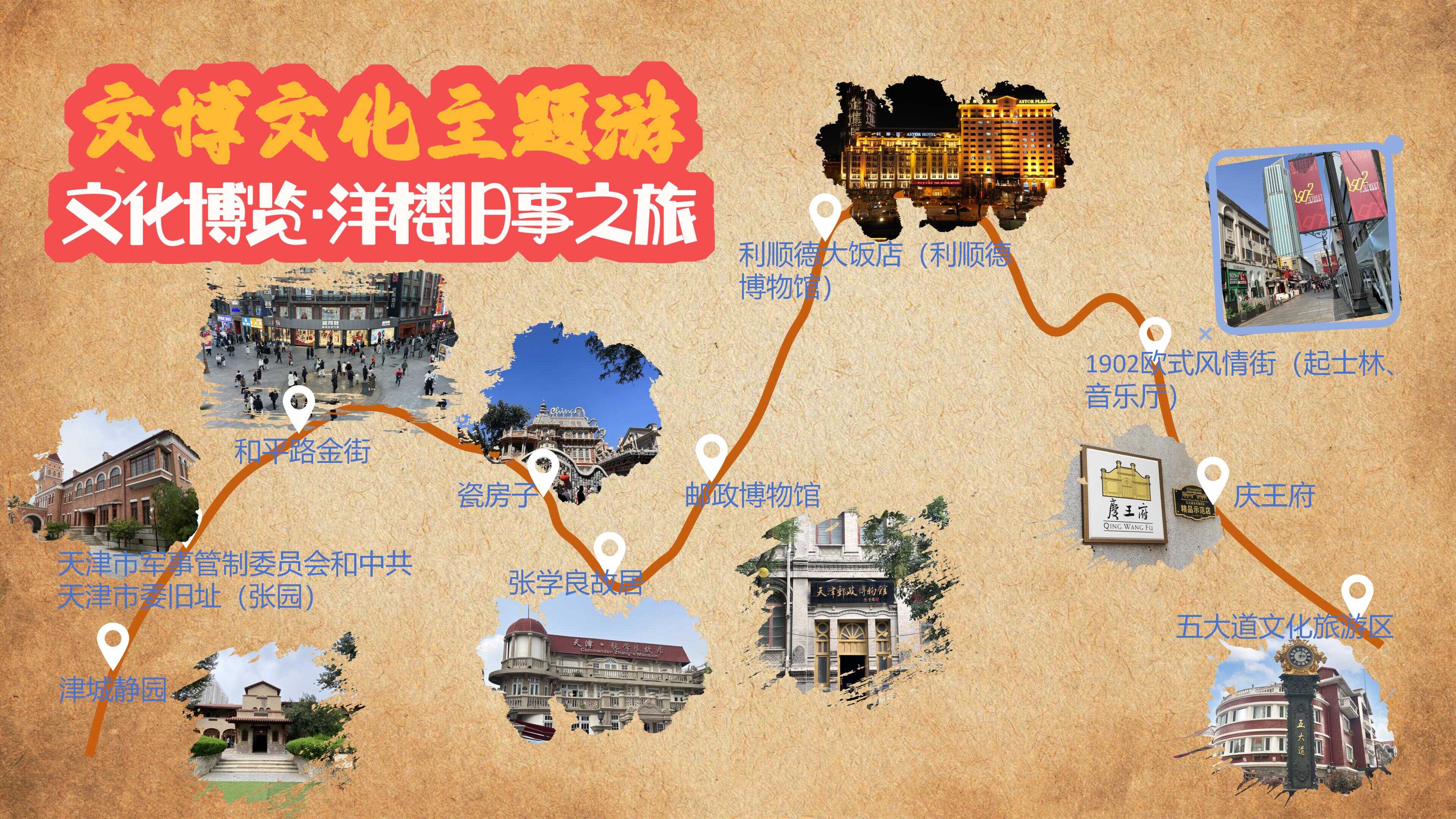 津城静园——天津市军事管制委员会和中共天津市委旧址(张园)——和平路金街——瓷房子——张学良故居——邮政博物馆——利顺德大饭店(利顺德博物馆)——1902欧式风情街(起士林、音乐厅)——庆王府——五大道文化旅游区