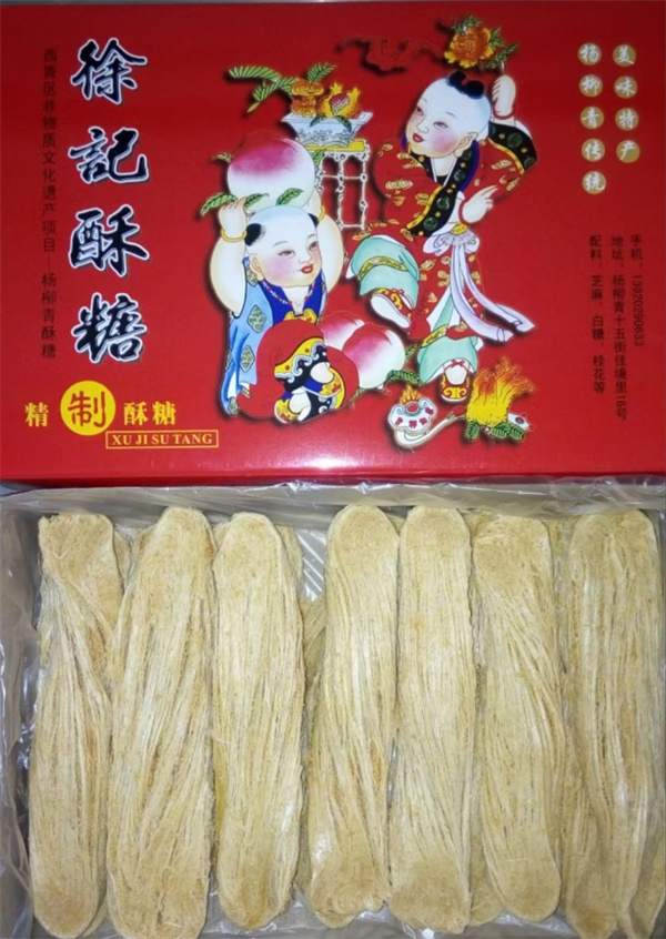杨柳青酥糖:纯手工式制作坊,经由手艺人上百次拉折,内部有着120余层的结构,其主要原料是芝麻、香油、白糖和桂花。制作工艺分为6个步骤,即加工芝麻、熬糖、拉折糖与芝麻的混合物、切成品、粘糖和包装。其中仅加工芝麻就要经过投水、去皮、晾干、火炒、出烟、拔糠、过筛、碾压等多道工序,且十分讲究火候的把握。