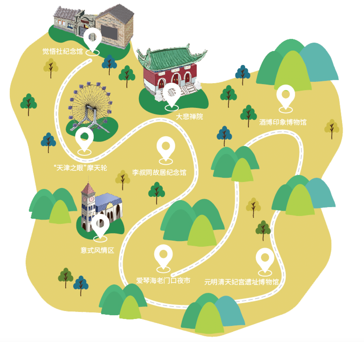 觉悟社纪念馆——“天津之眼”摩天轮——大悲禅院——李叔同故居纪念馆——意式风情区——元明清天妃宫遗址博物馆——酒博印象博物馆——爱琴海老门口夜市