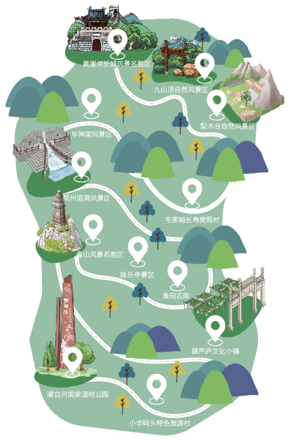 黄崖关长城风景名胜区——九山顶自然风景区——梨木台自然风景区——毛家峪长寿度假村(元古奇石林风景区)——车神架风景区——蓟州溶洞风景区——渔阳古街——独乐寺景区——盘山风景名胜区——葫芦庐文化小镇——小辛码头特色旅游村——潮白河国家湿地公园