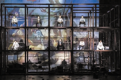 舞美设计也是这部大制作的核心。随着舞台搭建不断推进,整个戏剧面貌在天津大剧院歌剧厅的舞台上已初见端倪。舞美设计张武用百根巨型钢铁支架搭建出三层欲望楼阁,让观众从宏大叙事中抽离出来。值得一提的是,多媒体和实时摄影的加入,让这场3小时8分钟的宏大叙事多了几缕诡秘深邃的想象和举重若轻的真实感。实时摄影的加入如同调动着整个剧场的呼吸,舞台和当下既交错又融合,每个人既是寻梦者又是梦中人,于连、德·瑞纳夫人、玛蒂尔德以及在场的观众,都被摄像机记录其中,共同谱写爱与生命的四重奏。