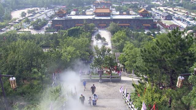 同时,为进一步改善游客暑期步行登山体验,盘山景区在售票大厅至福缘广场之间打造“雾森”景观,通过高压使水雾化,达到与自然雾相同的景观效果,在美化景观的同时,对增加环境湿度、降低周边温度、降低PM2.5、提高负氧离子浓度也有显著效果,让游客感受云雾缭绕的天然画卷,宛若仙境。