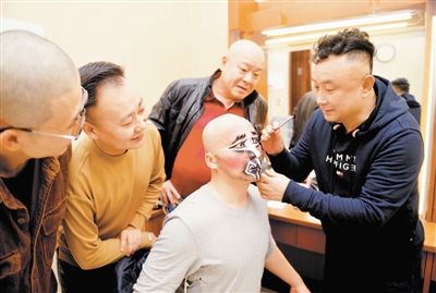 图为专场演出前京剧名家石晓亮(右一)在为弟子权守昌(右二)扮戏。 本报记者 庞剑摄
