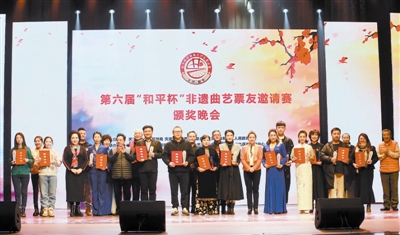 第六届“和平杯”非遗曲艺票友邀请赛颁奖暨汇报演出,昨晚在中国大戏院举行。现场,艺术家和票友们齐聚一堂,感受曲艺艺术的魅力。铁片大鼓、广西文场、信河道情、评弹等独具地方特色的曲艺表演形式登台表演,赢得天津观众热情的掌声。