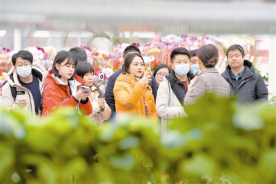 “欢乐京津冀 一起过大年”主题发布会昨天在津举行。来自京津冀三地的媒体记者分赴本市各亮点景区开展联合采访,三地共同分享文旅资源,拉开“欢乐京津冀 一起过大年”主题活动的序幕。图为三地记者在东丽区东信花卉基地采访。 本报记者 周伟摄