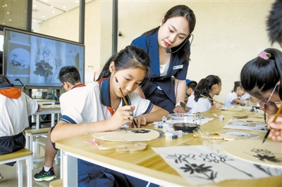 图为同学们尝试着在扇面上进行绘画。 本报记者 曹彤摄