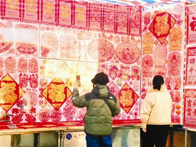 记者在采访中还发现,相较传统制作工艺的韵味,“有趣”更是年轻人的首选。“虽然富贵平安等寓意的窗花、吊钱儿特别受欢迎,但根据往年经验,现如今,进入正月以后要比现在消费人群更多,而且年轻人将成为主力,植绒立体的花式也更受欢迎。”一位专门销售植绒立体福字儿的摊主表示,以往老年人来得多,现在年轻人也来得不少,大家越来越注重文化的‘味道’,为此很多设计特别融入了“国潮”“动漫”风。“80后”“90后”成家立业,成为消费主力,“千禧一代”的购买力也不容小觑,如何迎合他们的消费需求,自己也做足了功课,“这个醒狮图案福字,是我们的爆品,头戴醒狮帽的小蛇可爱又威风,买回去讨个好彩头。”
