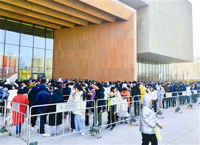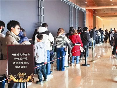昨日上午,记者在天博门口看到现场的蛇形队伍排的里三层外三层,入口处核验身份证及安检的观众有条不紊。工作人员向记者介绍,观众基本都是为“天开一统——秦汉文物主题展”而来,“太火了!馆里的同事也都在加班加点,维持秩序。”工作人员表示,大家都没想到参观者排队排到了馆外的空地上,“昨天有一段高峰期,队伍已经排到了平江道上……”