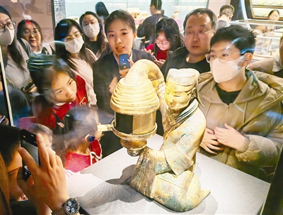 元旦以来,“天开一统——秦汉文物主题展”在天津博物馆开展,吸引了数万市民游客前往感受千年文物风采。尤其是此次大展的“明星”,西汉长信宫灯真品到津“出差”,现场上千人排队看展,炒热全城话题。本报记者昨日前往大展现场看到排队盛况,观众想要看到长信宫灯真容需要排四次队。更有游客表示,为了看到中华第一灯“本灯”不惜排队3小时,甚至没吃午饭。