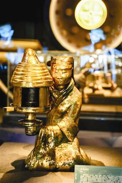 河北博物馆馆藏的长信宫灯,铜质鎏金,由头部、身躯、右臂、灯座、灯盘、灯罩六个部分组成,每部分都可简单地拆卸重装。