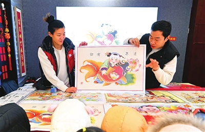 “接(揭)福啦!”走进古文化街杨柳青画店,天津杨柳青画社木版水印传承人苏丽妍正在指导游客体验年画的拓印环节。