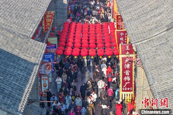 图为1月29日,市民和游客在天津古文化街游玩。(无人机照片)中新社记者 佟郁 摄