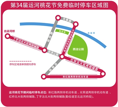 桃花堤:采取单进单出管理,中环线勤俭桥桃花园大门设置为入口,光荣道北洋园大门、红塔寺大道桃诗园大门设置为出口,请单向顺行,从桃花园至北洋园沿北运河方向游览,避免拥堵。