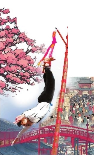 108式的名称都很简单,比如“转悠悠”,就是人在杆顶,悬在绳子和木棍合成的道具上借助惯性的力量转圈,当道具不转了,整个人突然从空中垂直下沉,脚面弯曲倒挂在道具上,这叫“挂脚面”;还有人在杆上摆成糖人的形态,展开双手滑下来,叫“墩糖人”。