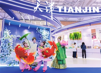 此次天津展团的参展单位数量、展品品类和数量均为历届之最,天津展区也从“观展”向“玩展”升级,主打视觉、嗅觉、听觉、味觉、触觉全方位沉浸式体验,尤其是杨柳青木版年画娃娃造型、佩戴着非遗技艺制作的首饰的大小演员,生动展示了非遗之美,吸引了海内外嘉宾驻足欣赏;穿着印有杨柳青木版年画与版权符号衣服的专业服务团队,为观众提供展区导览、互动活动讲解、版权咨询等服务。