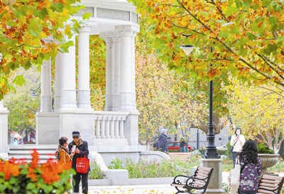 和平区的睦南公园、中心公园等小公园虽面积不大,却藏着精致的落叶景观。睦南公园里悬铃木、垂柳、玉兰、皂角、以及不落叶的常青树雪松,搭配得错落有致,当树叶落在修剪整齐的绿篱旁,更与花架融为一体,形成别样的美。现场常有市民坐在花架下的长椅上,看着落叶发呆,享受片刻的宁静。中心公园的悬铃木和龙枣树是园内的亮点,树冠遮天蔽日,落叶铺在圆形的步道上,形成天然的“金黄圆环”。这些小公园,散布在繁华街区中,逛累了便能走进一处,邂逅秋日小确幸。