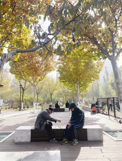 植物品类多是这个公园的一大特色,步道旁有梧桐、白桦、槐树、银杏、白蜡、五角枫、杨树、丝木棉等,树木高矮错落有致,色彩层层叠叠。园中随处都是缀满红色果实的金银忍冬,由于它比较耐寒,可以露地越冬,有助于光合作用。听一位散步的老人说,初秋时节还能见到南方的刺梨。更引人注目的是草坪边缘的三五主播:有人举着手机直播落叶纷飞的画面;有人对着镜头示范健美操……生态草坪区的长椅上,有人静坐读书,有人仰面享受午后暖阳,廊架下散步休闲的人仿佛将时光也织进了这慵懒的初冬。