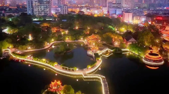 灯光一起,湖心亭倒映水中,柔光勾勒飞檐,恍若琼楼玉宇;