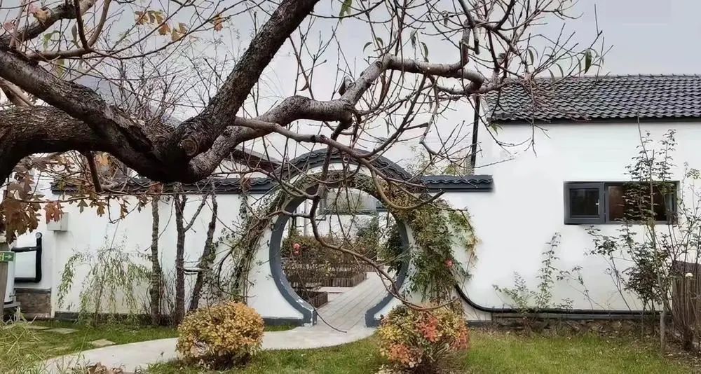 从蓟州城区出发,沿着山间公路行驶不久,便来到下营镇石头营村的一座院落前。门外竹林环绕,院内杏花、玉兰、迎春花含苞待放。拱形门蔷薇环绕,八角亭立于中央,远山可见。