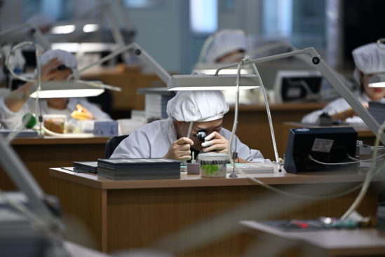 在天津海鸥表业集团生产车间内,员工在操作台前组装手表。